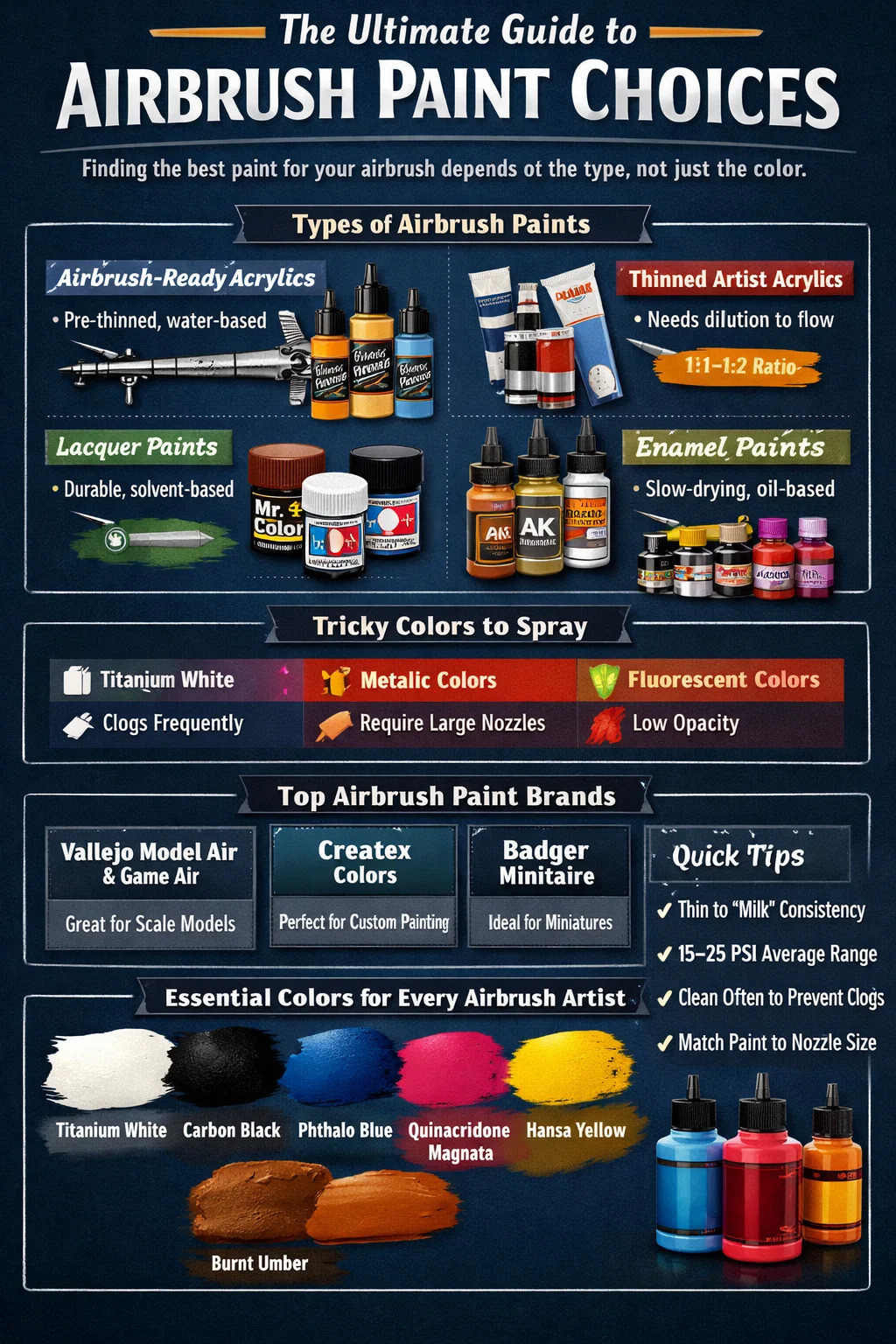Antes de mergulhar em tons específicos, é importante entender que um aerógrafo não distingue entre vermelho e azul – ele distingue entre tinta que flui e tinta que entope. O meio (o tipo de tinta) é o maior fator no desempenho do aerógrafo. Aqui está uma análise das principais categorias: