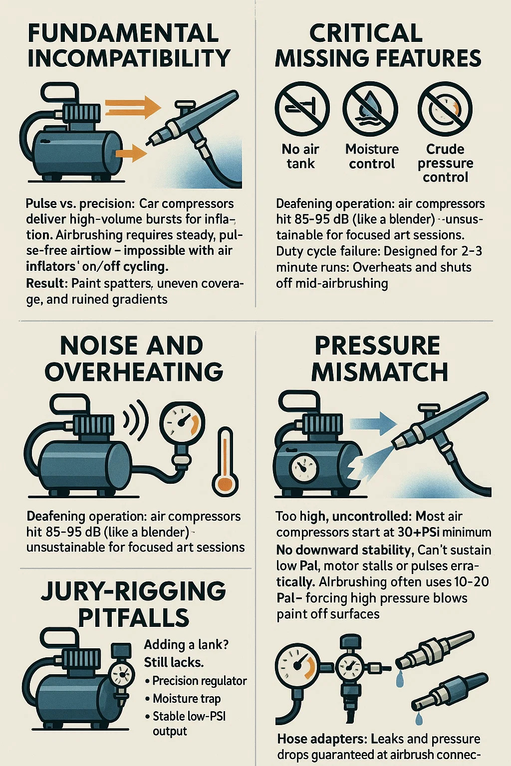 Pulso vs. Precisão: Os compressores automotivos fornecem rajadas de alto volume para inflação. A aerografia requer fluxo de ar constante e sem pulso – impossível com o ciclo liga/desliga dos infladores de ar.