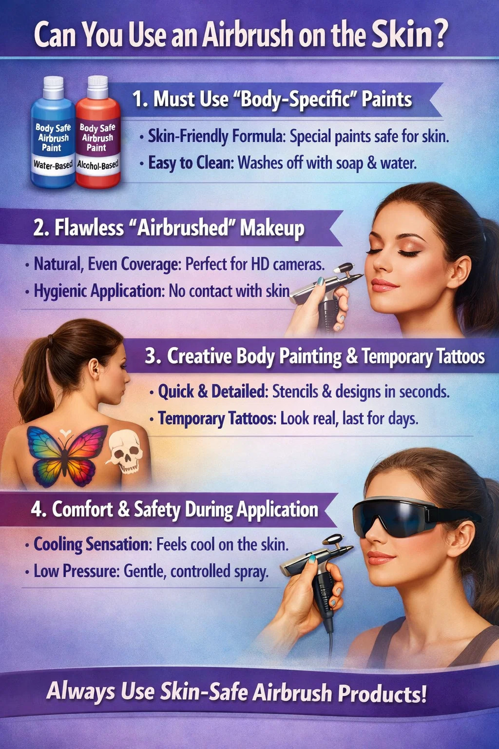 Fórmula amiga da pele: As tintas para aerógrafo projetadas especificamente para a pele são geralmente à base de água ou álcool e seus ingredientes atendem aos padrões de segurança cosmética. Têm textura extremamente leve e não obstruem os poros nem causam alergias como as tintas comuns.