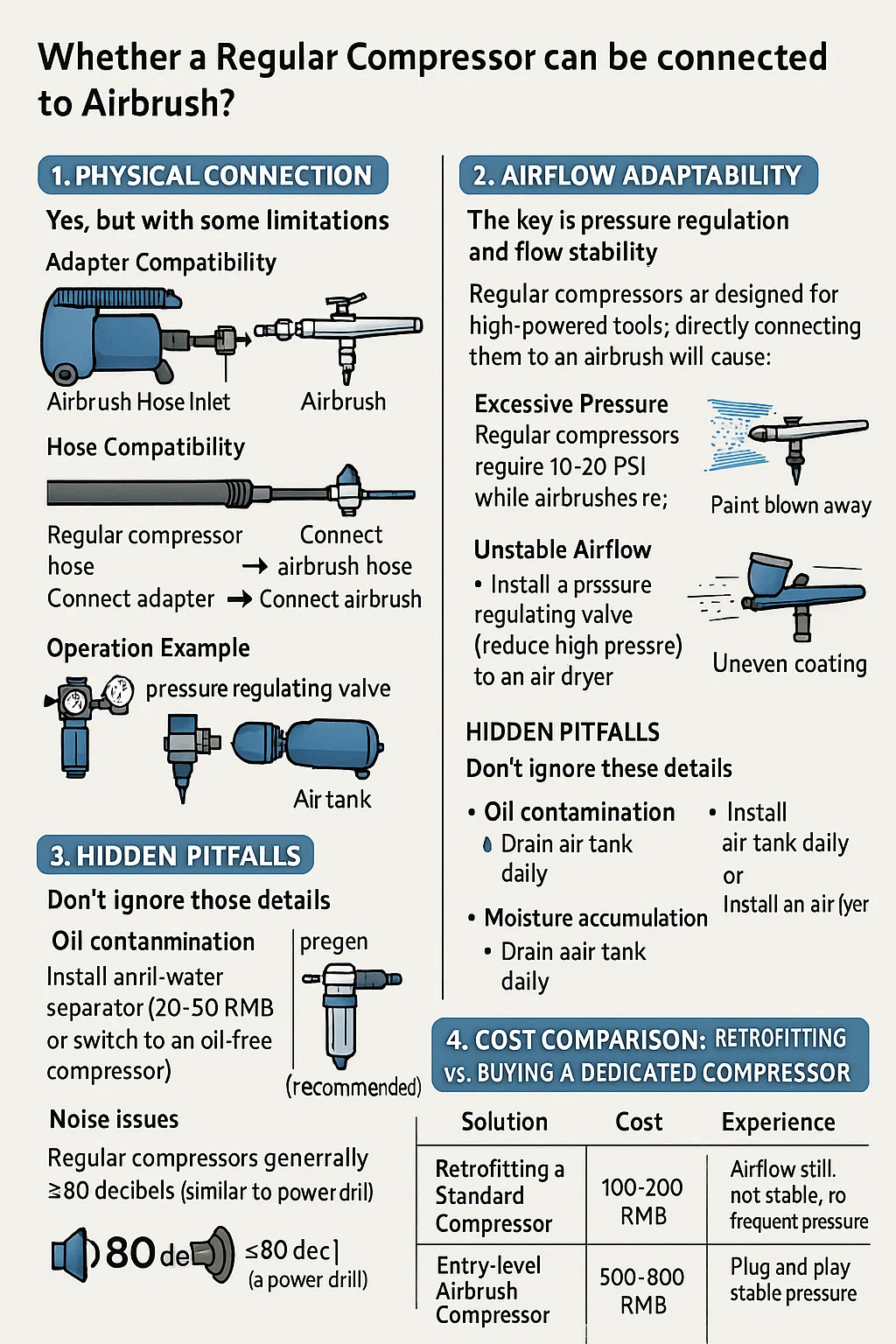 Compatibilidade do adaptador: As entradas da mangueira do aerógrafo são normalmente pequenas (por exemplo, 1/8 de polegada), enquanto as saídas normais do compressor são maiores (por exemplo, 1/4 de polegada). Um adaptador (com preço entre 5-20 RMB) precisa ser adquirido online.